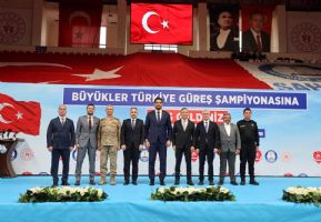 Büyükler Türkiye Güreş Şampiyonası açılış gününde; Gaziantep Valisi Kemal Çeber, Şahinbey Belediye Başkanı Mehmet Tahmazoğlu, Gaziantep Gençlik ve Spor İl Müdürü Numan Nafiz Şahin ve TGF Başkanı Taha Akgül yer aldı.